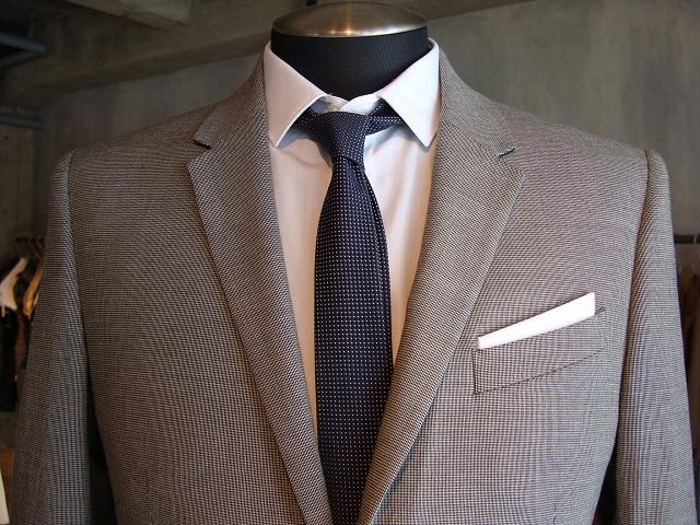 中に着たシャツは、写真では分かりませんが、袖のカフス部分が白からネイビーのグラデーションになっており、5㎝幅の細めのネクタイはシルク素材のネイビーのピンドットで若々しい印象になっています。